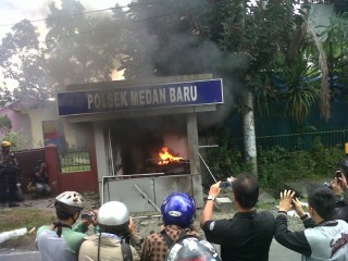 Ratusan mahasiswa merusak dan membakar Pos Polisi Polsek Medan Baru di Jalan Kapten Pattimura, simpang Jalan Jend Sudirman,