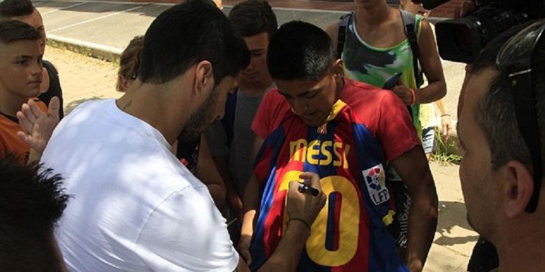 Penyerang Barcelona, Luis Suarez, membubuhkan tanda tangan di atas replika kostum Lionel Messi, milik seorang penggemar, ketika menjalani program latihan individu di Pyrennes, seperti dilansir Daily Mail, Selasa (29/7/2014).