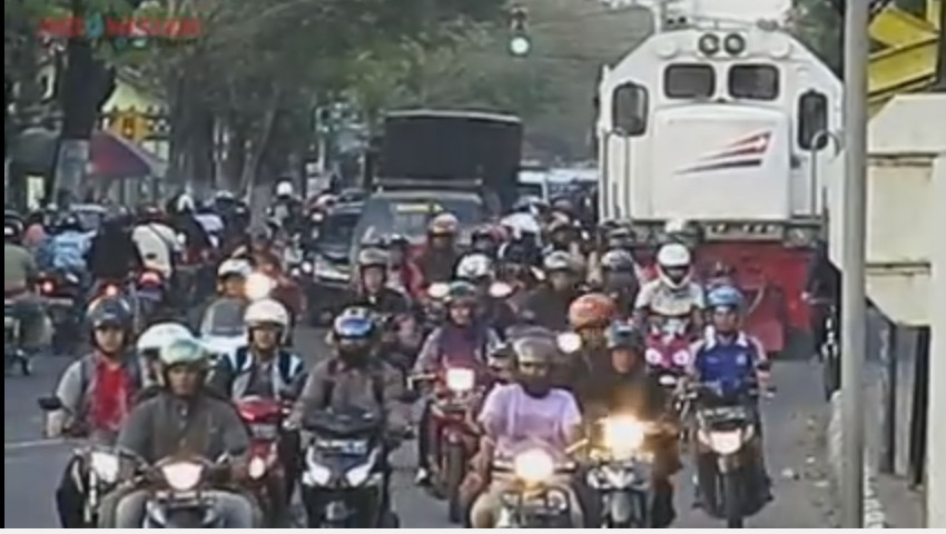Jalur kereta di Madiun juga dilintasi oleh para pengendara sepeda motor yang tampak tumpah di tengah jalan