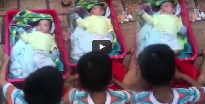 Orang-orang mengerumuni mereka dan sang bocah laki-laki terus memegangi keranjang merah tempat adiknya berbaring.