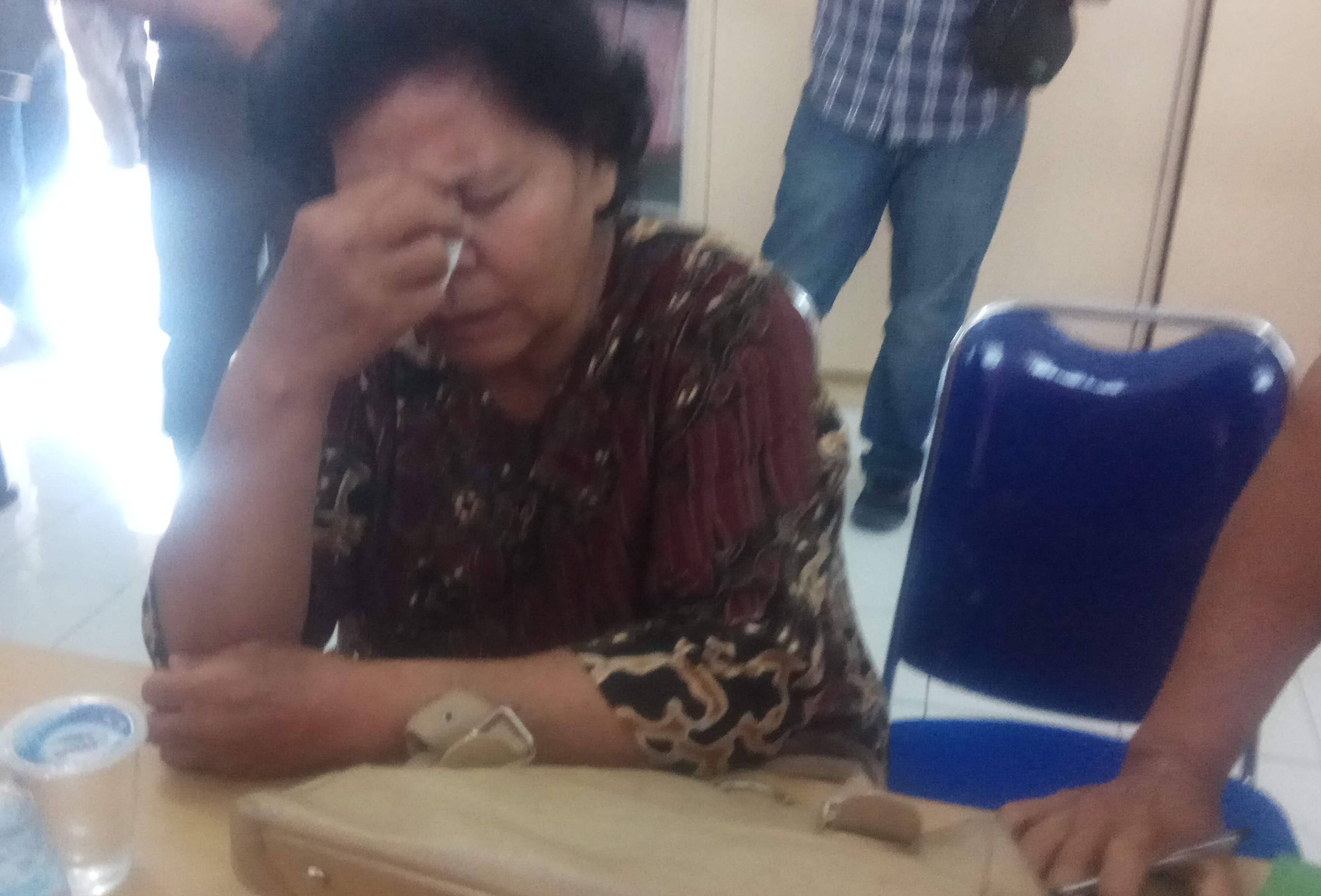 Demseria duduk di bangku kemudian tertunduk lesu, dan sesekali menyeka buliran air matanya menggunakan tisu dan terisak.