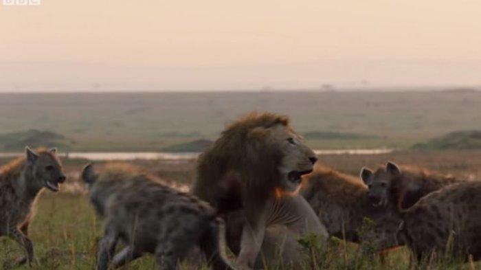 Video tersebut menampilkan seekor singa jantan yang harus berhadapan dengan sekitar 20 hyena.