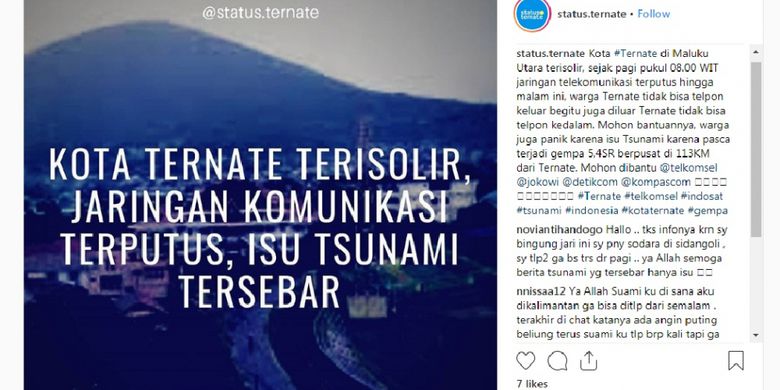 Disebutkan dalam laporan Instagram tersebut, hingga Rabu malam warga Ternate tidak bisa melakukan panggilan telepon keluar, sementara warga luar Ternate tidak bisa menelepon ke Ternate.