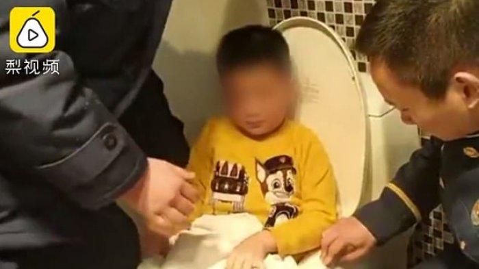 Diketahui, bocah itu terjebak di dalam kloset saat tengah sibuk bermain game ponsel.