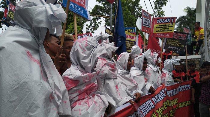 TRIBUN MEDAN.com-Puluhan buruh dari Aliansi Pekerja Buruh Daerah Sumatera Utara (APBD-SU) menggeruduk Kantor Gubernur, Jalan Pangeran Diponegoro, Kota Medan, Selasa (30/4/2019).