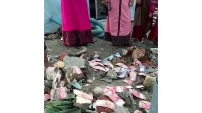 Terlihat jelas berserakan uang pecahan Rp 100.000, dan Rp 50.000 di tanah yang tertimbun dengan batu-batuan.