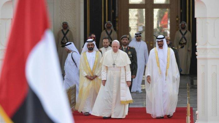 Paus Fransiskus saat menghadiri upacara penyambutan di samping Putra Mahkota Uni Emirat Arab Mohammed bin Zayed Al-Nahyan dan Wakil Presiden UAE serta pemimpin Dubai Sheikh Mohammed bin Rashid al-Maktoum di Istana Kepresidenan di Abu Dhabi, Uni Emirat Arab, 4 Februari 2019 lalu.