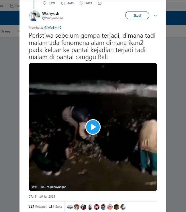 "Peristiwa sebelum gempa terjadi, dimana tadi malam ada fenomena alam dimana ikan2 pada keluar ke pantai kejadian terjadi tadi malam di pantai canggu Bali." tulis @Wahyu02Pas.
