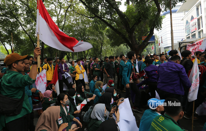 TRIBUN-MEDAN.com, MEDAN - Massa yang tergabung Badan Eksekutif Mahasiswa (BEM) Sumut melakukan aksi menolak Revisi Undang-Undang KPK, di depan Kantor DPRD Sumut, Medan, Kamis (12/9/2019).