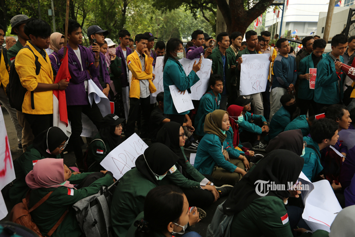 Aksi yang diikuti puluhan mahasiswa tersebut untuk menolak rencana Revisi Undang-Undang (UU) KPK yang diusulkan oleh DPR.(sky/tribun-medan.com)