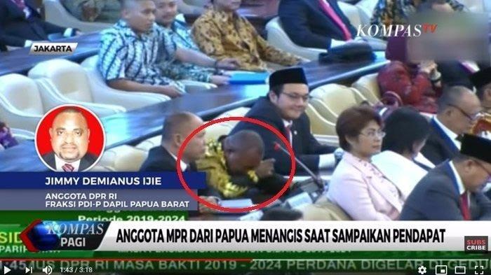 TRIBUN-MEDAN.COM -- Anggota DPR dari Dapil Papua Jimmy Demianus Ijie menangis saat interupsi di sidang Paripurna MPR RI di Jakarta pada Rabu (2/10/2019).