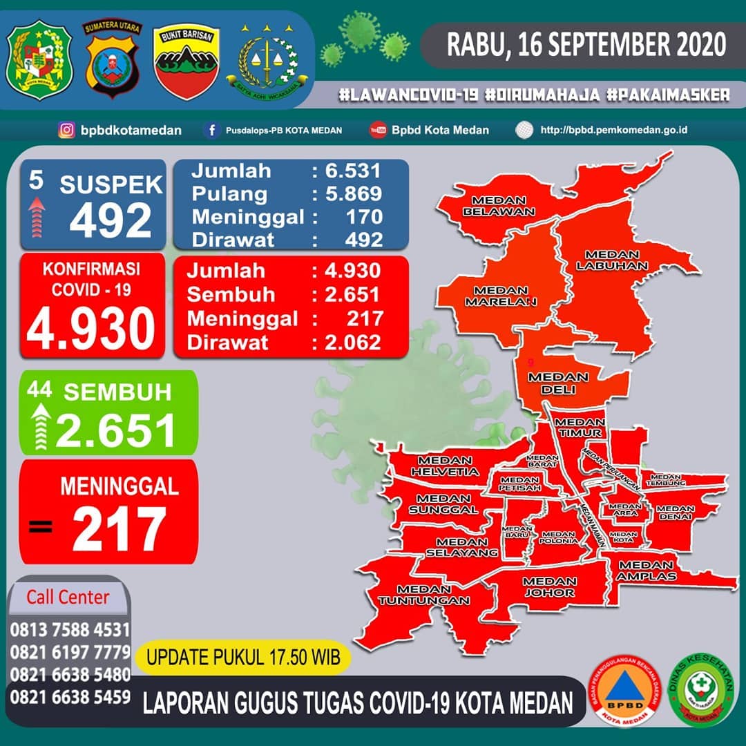 TRI BUN-MEDAN.com, MEDAN - Kasus Covid-19 di Kota Medan bertambah 61 kasus hingga nyaris menembus lima ribu orang hingga, Rabu (16/9/2020).
