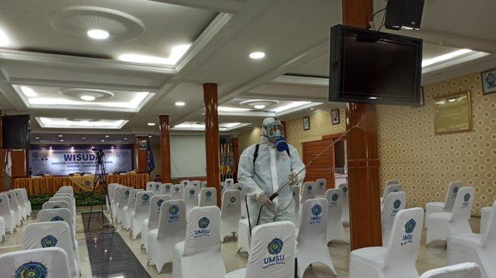 Dalam menjaga sterilisasi ruangan, pihak UMSU juga turut melakukan penyemprotan disinfektan di beberapa titik lokasi wisuda sebelum dan sesudah penggunaan ruangan.
