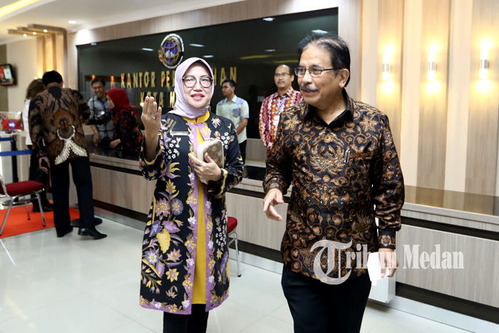 Menteri ATR/ Kepala BPN Sofyan Djalil (kanan) berbincang dengan Kepala Kantor Pertanahan Kota Medan Sri Puspita Dewi saat tiba, di Kantor Pertanahan Kota Medan, Sabtu (8/2/2020). Sofyan Djalil hadir untuk membagikan 200 sertipikat tanah kepada warga dan juga tanah wakaf, rumah ibadah serta kepolisian.