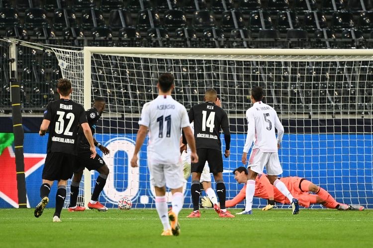 Proses gol kedua penyerang Borussia Moenchengladbach Marcus Thuram ke gawang Real Madrid pada laga matchday kedua Grup B Liga Champions di Stadion Borussia Park, Selasa (27/10/2020) atau Rabu dini hari WIB.