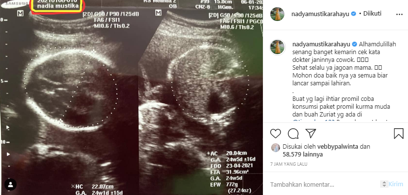 "Alhamdulillah senang banget kemarin cek kata dokter janinnya cowok." tulis Nadya Mustika dikutip TribunStyle.com, Selasa (12/1/2021).