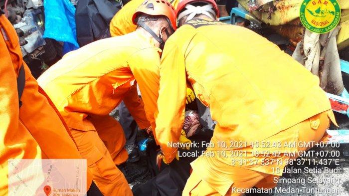 TRIBUN-MEDAN.com, MEDAN - Petugas Siaga Rescuer Basarnas Medan mengevakuasi mayat korban laka maut Nurhaida Hasibuan (59) yang tewas tertabrak truk di Jalan Setia Budi Ujung, Simpang Selayang Medan, Rabu (10/2/2021).