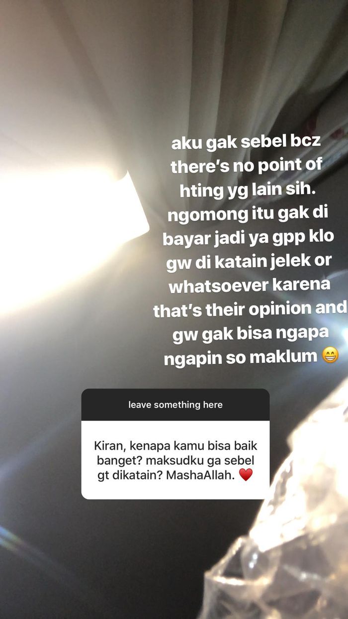 "Aku gak sebel bcz there's no point of hting yg lain sih, ngomong itu gak dibayar jadi ya gpp kalau gue dikatain jelek or whatsoever karena that is their opinion and gw gak bisa ngapa ngapain so maklum," jawab Khirani.