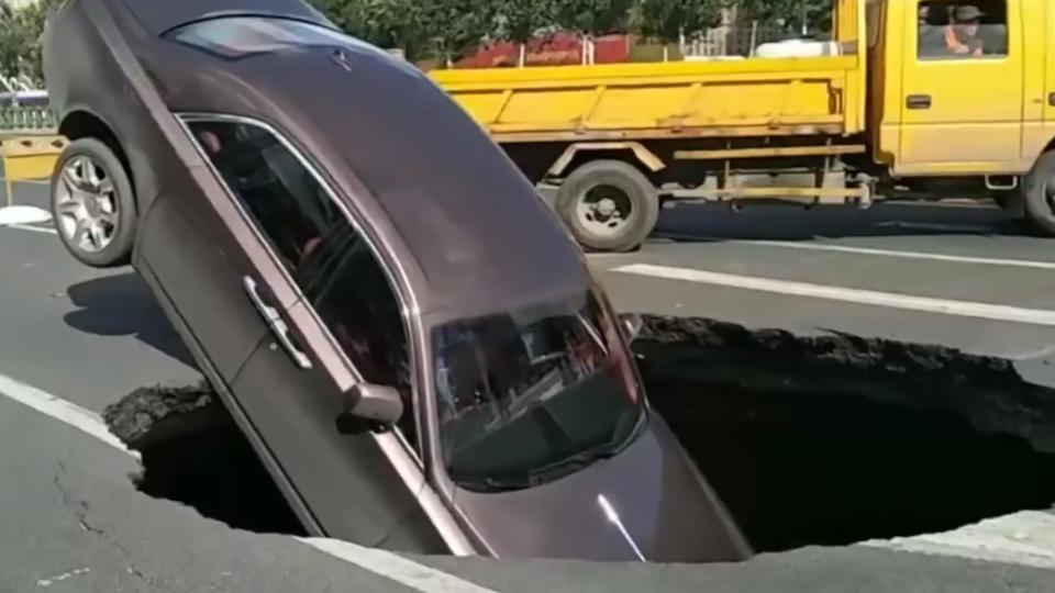 Rekaman CCTV menunjukkan tiga mobil jatuh ke dalam lubang yang mencapai lebih dari 91 meter.