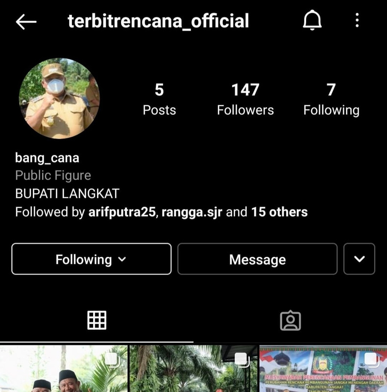 "Jangan mudah percaya dengan chatnya. Akun facebook Bupati yang asli dan resmi hanya bernama "Terbit Rencana Perangin Angin" dan akun instagramnya yang asli bernama "terbitrencana_official". Selain itu, semuanya palsu," tegas Kadis Kominfo.