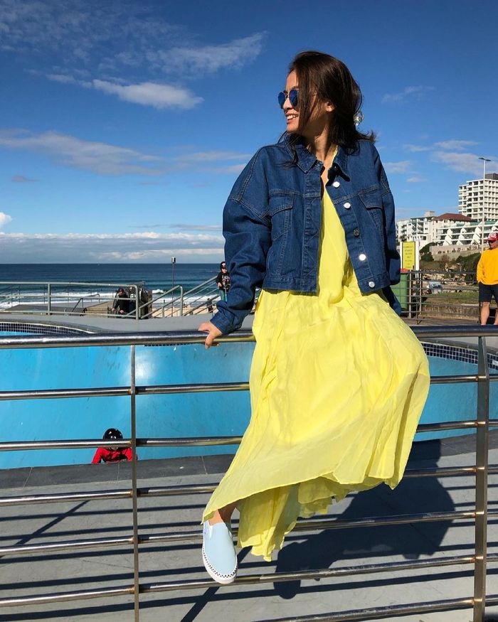 Dress tersebut dilengkapi dengan jaket jeans lengan panjang sebagai outer.