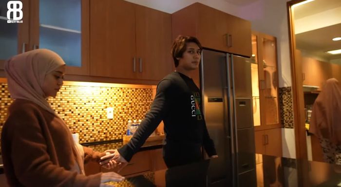 Dapur di rumah artis Rizky Billar dan Lesti Kejora terlihat cukup luas dengan kitchen set berwarna cokelat yang menempel di sebagian sisi.