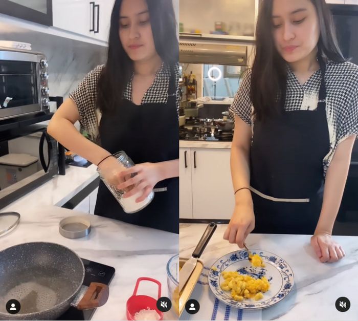 Saat sedang memasak, terlihat jelas area dapur di rumah artis tersebut.