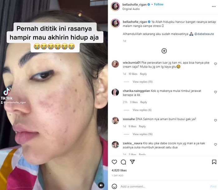Postingan Bella Shofie dengan potret wajahnya yang tak mulus