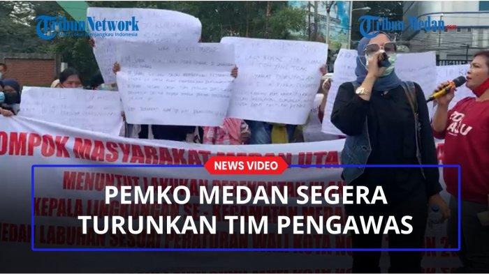 TRIBUN-MEDAN.COM, MEDAN - Puluhan orang yang tergabung dalam Kelompok Masyarakat Medan Utara Bersatu melakukan demo di depan Kantor Wali Kota Medan, Senin (21/3/2022).