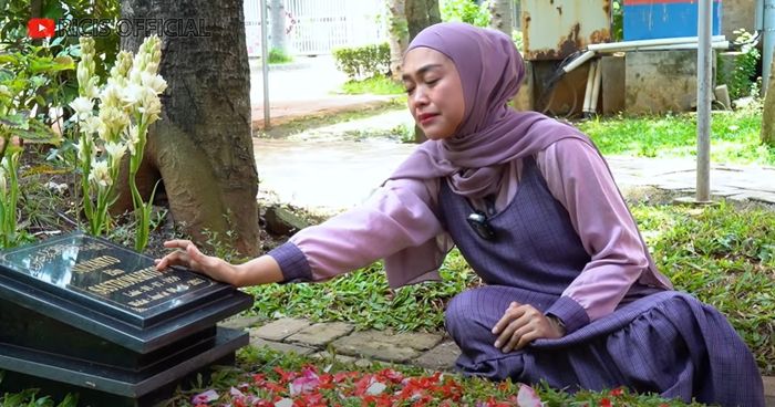 Ia pun tak kuasa menahan tangisnya di depan kuburan sang ayah.