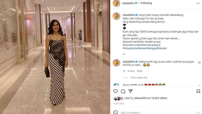 "Buat yang lagi DEMO semoga aspirasinya didengar jaga sikap dan jgn merusak. Kasian aparat yg bertugas biar aman dan damai. Selamat menjalankan ibadah puasa," tulis Iis Dahlia.