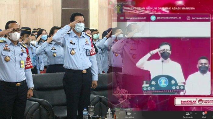 TRIBUN-MEDAN.com, MEDAN - Kantor Wilayah Kementerian Hukum dan Hak Asasi Manusia Sumatera Utara mengikuti kegiatan Apel Pegawai dan Halal Bihalal secara virtual bersama Menteri Hukum dan Hak Asasi Manusia Republik Indonesia, Senin (9/5/2022) yang dilaksanakan di aula Soepomo Kantor Wilayah.
