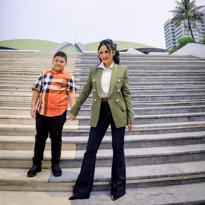 Potret Krisdayanti dan sang putra Kellen Lemos di depan gedung DPR RI.