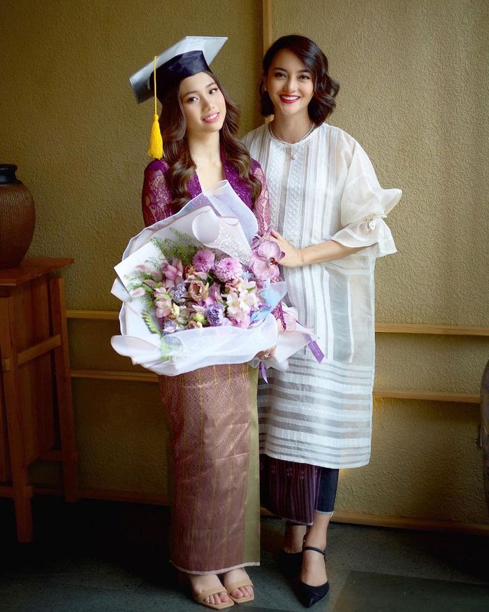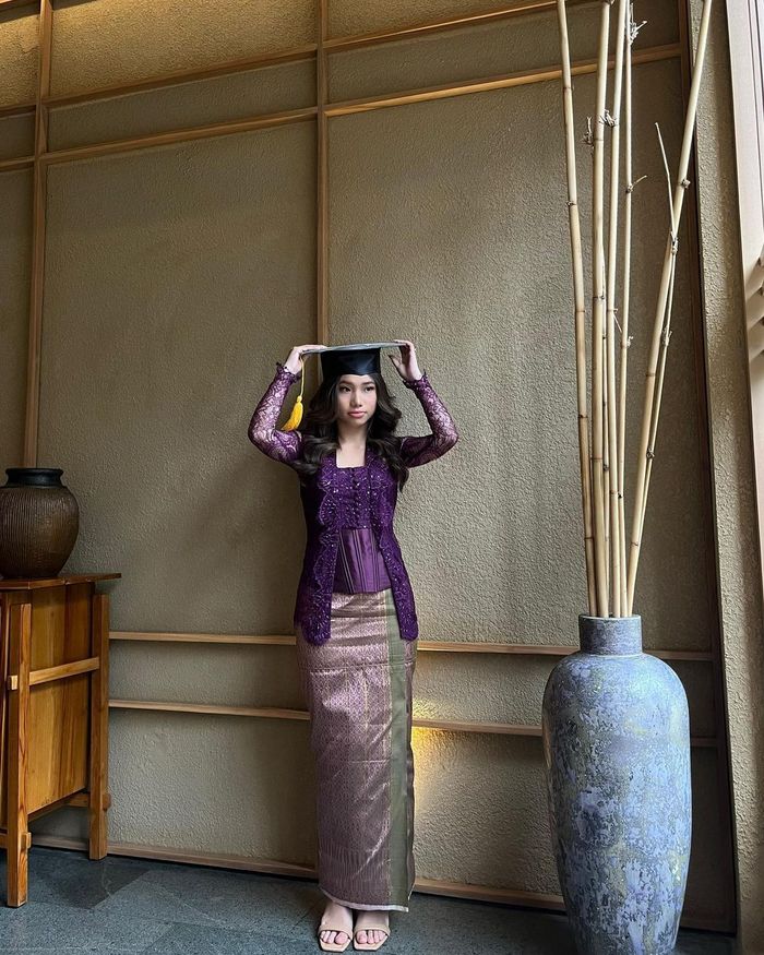 Tampil anggun dan manis di hari kelulusannya, Jasmine Abeng tampak memadukan kebaya dan kain Bugis berwarna ungu.