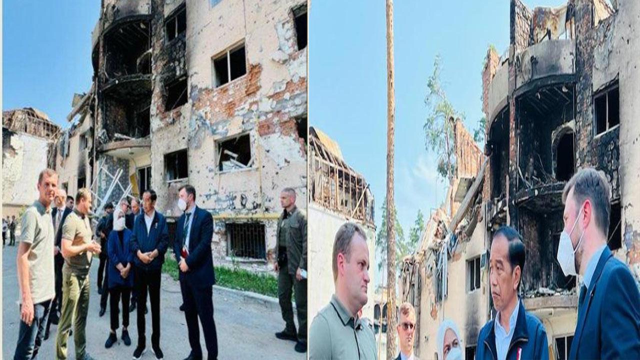 Presiden Jokowi dalam lawatannya ke Ukraina mendatangi kompleks Apartemen Lipky di Kota Irpin, melihat puing-puing bangunan yang rusak akibat perang.