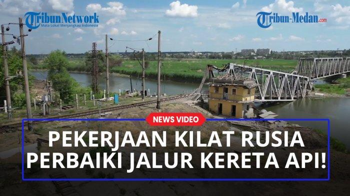 TRIBUN-MEDAN.com - Pasukan Spesialis Kereta Api distrik Militer Barat Rusia melakukan pekerjaan kilat perbaikan jalur rel yang hancur, Selasa (5/7/2022).