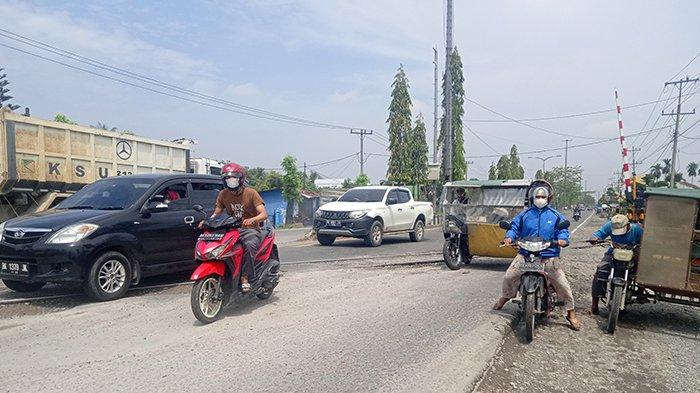 Kondisi Jalan Lintas Sumatera (Jalinsum) kawasan titik rel kereta api Desa Pagar Jati Kecamatan Lubukpakam Kabupaten Deliserdang kondisinya kian parah