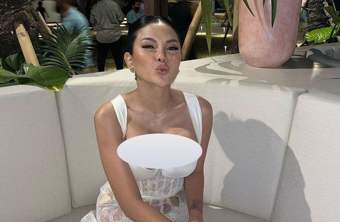 Dalam kesempatan itu, Nikita menggunakan gaun putih dengan belahan rendah yang membuat penampilan bagian payudaranya terangkat.