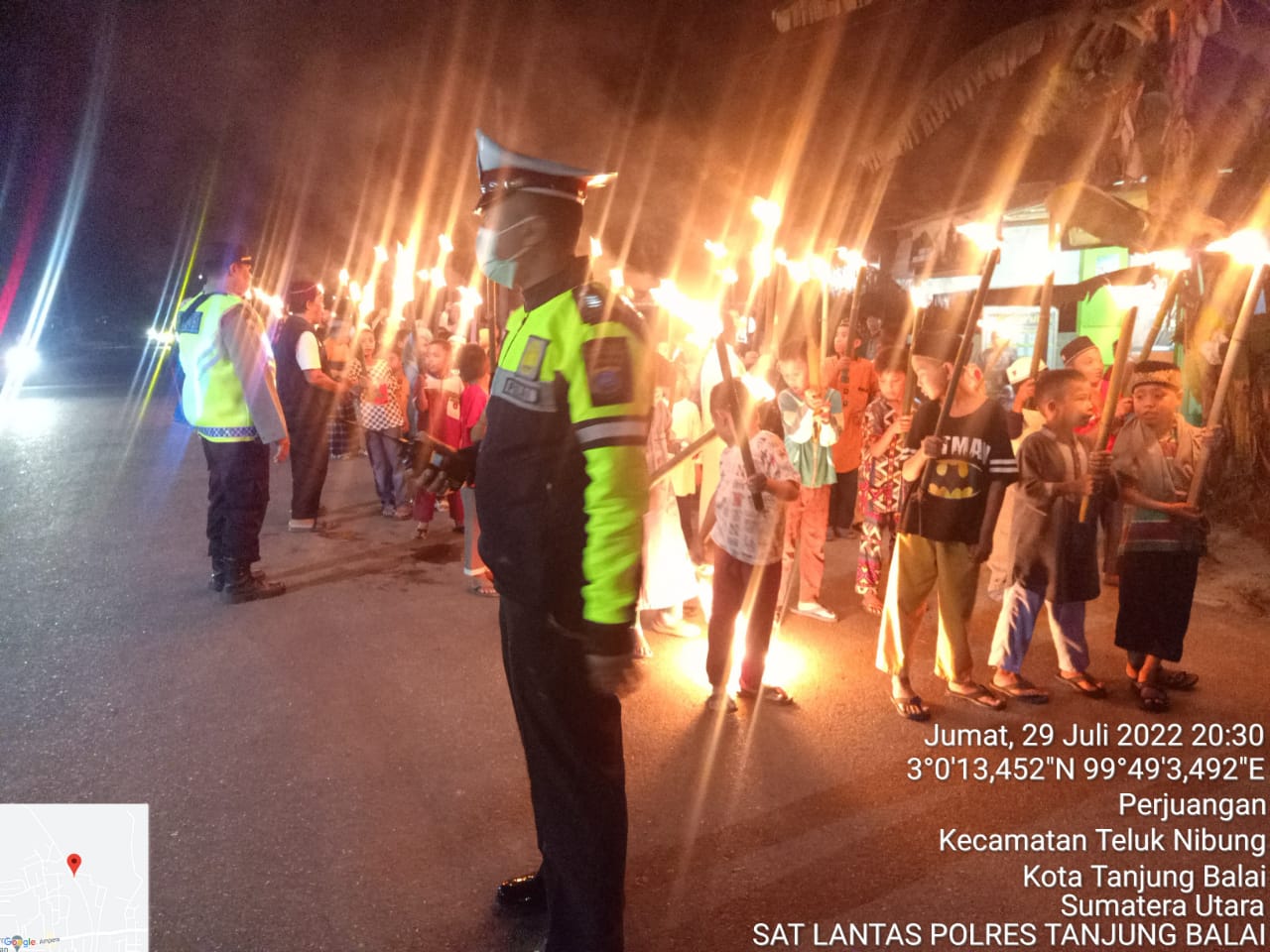 TRIBUN-MEDAN.COM, TANJUNGBALAI -Personil Polres Tanjungbalai melaksanakan kegiatan pengawalan, pengamanan dan pengaturan arus lalu lintas dalam rangka pawai obor menyambut Tahun Baru Islam yang diadakan di Masjid Nurul Amin Kecamatan Teluk Nibung Kota Tanjungbalai, Jumat (29/7/2022).