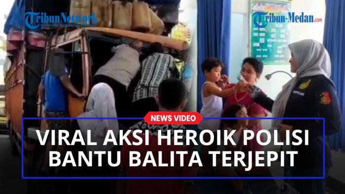 viral aksi heroik personel polisi Polsek NA-IX X, Polres Labuhanbatu yang menolong balita terjepit saat kecelakaan sebuah mobil truk.