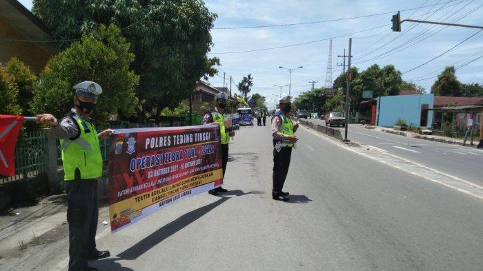 TRIBUN-MEDAN.com, TEBINGTINGGI - Dalam rangkaian operasi Zebra Toba 2022 Satgas II Preemtif Satlantas Polres Tebingtinggi memberikan edukasi kepada masyarakat tentang tertib berlalulintas, kegiatan berlangsung di beberapa ruas jalan seputaran Kota Tebingtinggi pada Kamis (6/10/2022).