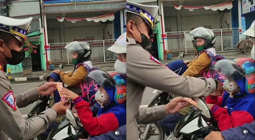 “Coklat kasih sayang dari pak polisi karena adeknya sudah tertib berlalu lintas dengan memakai helm,” tulis @terangmedia pada keterangan unggahannya.