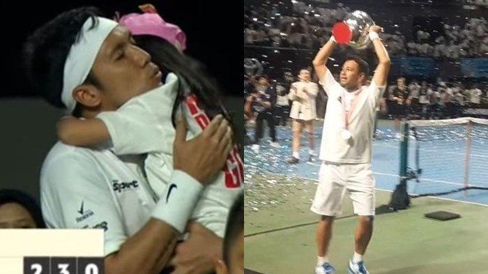 Saat menang dua set, Raffi Ahmad langsung lempar raket ke udara, suami Nagita Slavina terlihat bangga dengan keberhasilannya lawan Desta di depan ribuan pasang mata.