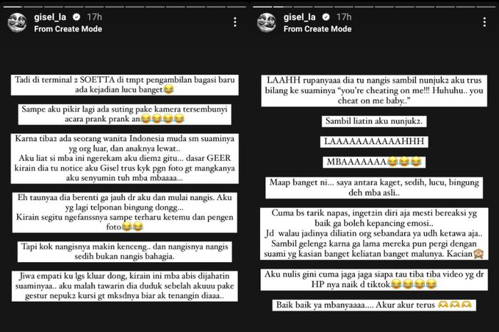 "Lah rupanya dia itu nangis sambil nunjuk-nunjuk aku, terus bilang ke suaminya, 'You're cheating on me! Huhu, you cheat on me baby'," tulis Gisel.