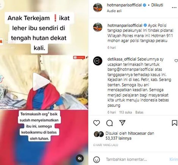 Hotman minta polisi turun tangan terkait tindakan tak manusiawi anak terhadap ibu kandungnya tersebut.