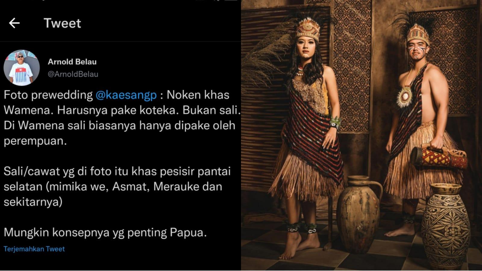 Namun, foto Kaesang dan Erina dengan konsep busana Papua tersebut juga menjadi sorotan warganet, termasuk warga Papua sendiri, Arnold Belau.