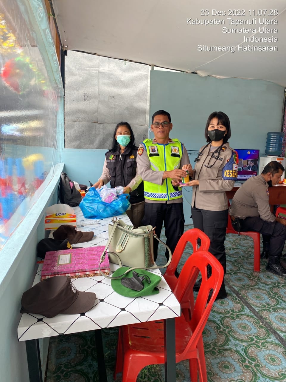 Pada kegiatan yang digelar Jumat, 23 Desember 2022, mulai 09.00 WIB, para personil Sie Dokkes yang dipimpin Ipda dr. Deasy Handayani Purba menyambangi pos pelayanan II Nataru di Sipoholon, Kecamatan Sipoholon, Taput.