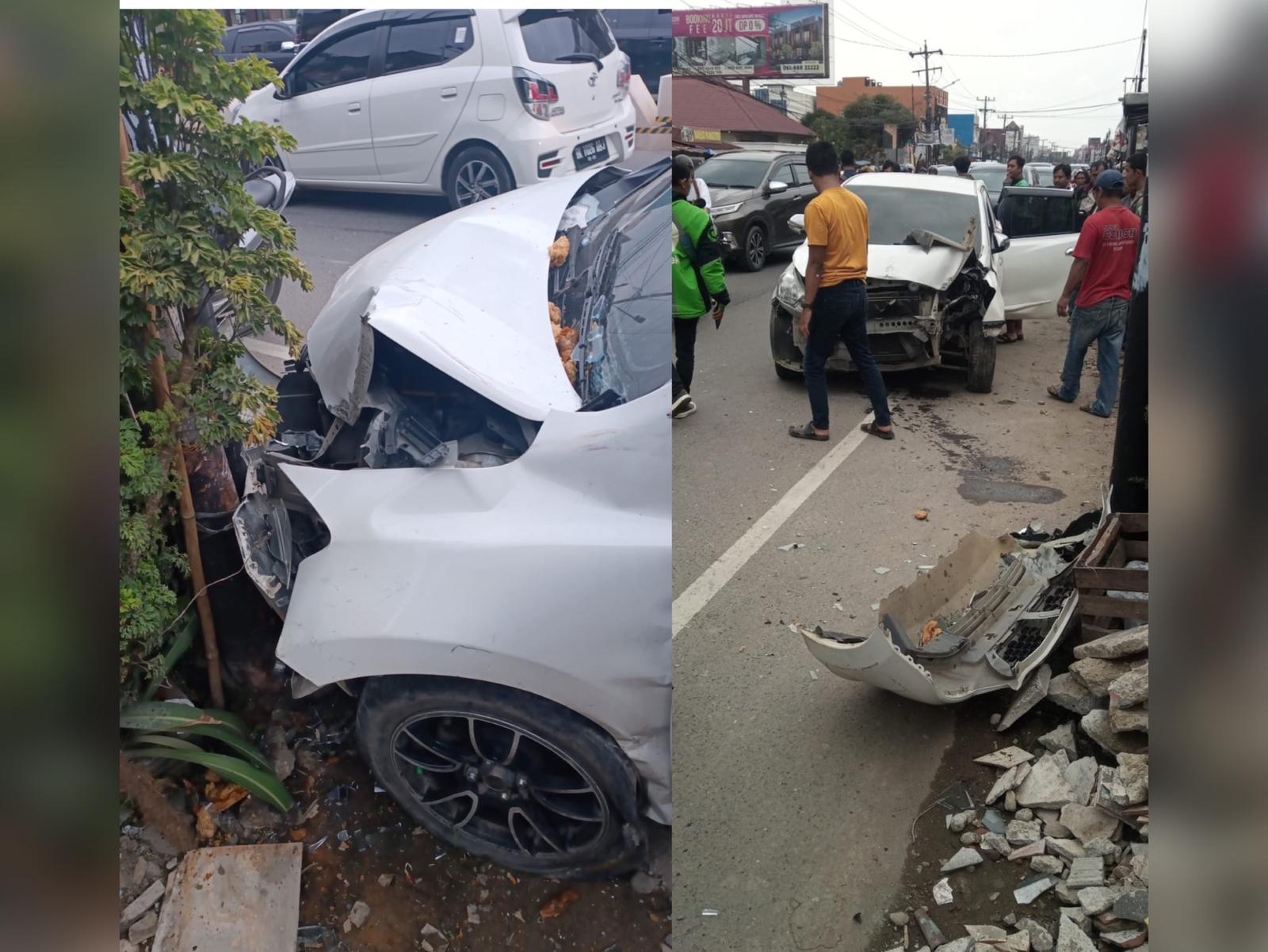 Mobil baru berhenti melaju setelah menabrak tiang listrik yang berada di lokasi.