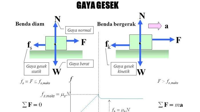Gaya gesek adalah gaya yang searah dengan gerak suatu benda atau berlawanan arah dengan arah gerak benda tersebut. Gesekan dibagi menjadi dua jenis: gesekan statis dan gesekan kinetik. Apa bedanya? Gesekan statis bekerja pada benda yang diam, dan gesekan kinetik bekerja pada benda yang bergerak.