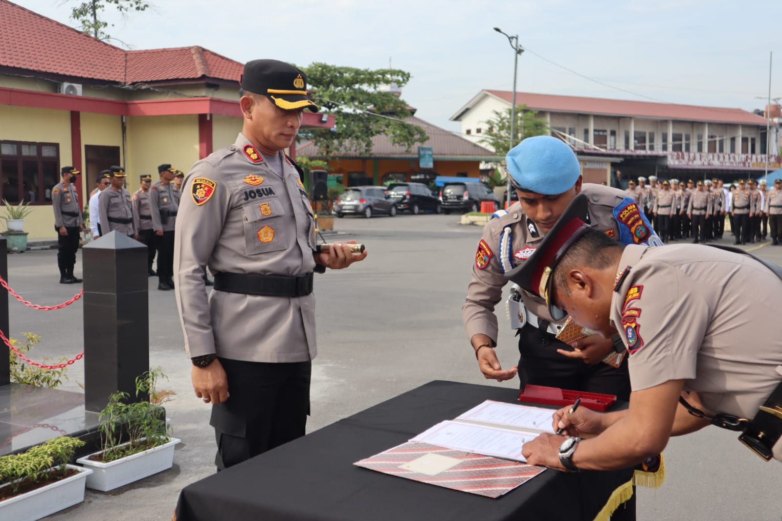 Kapolres Pelabuhan Belawan AKBP Josua Tampubolon, SH MH memimpin upacara serah terima Jabatan Wakapolres dan Kasat Reskrim Polres Pelabuhan Belawan p